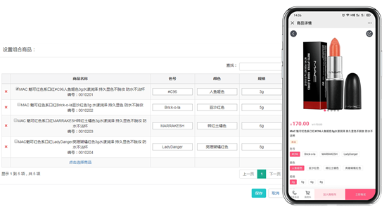 后台“商品列表”可“设置组合商品”,将同一名称,规格型号等不同的商品组合显示到同一商品详情的属性,用作选择项显示,方便快捷查看。